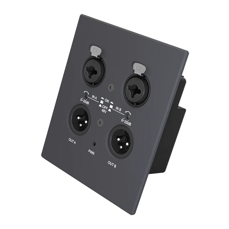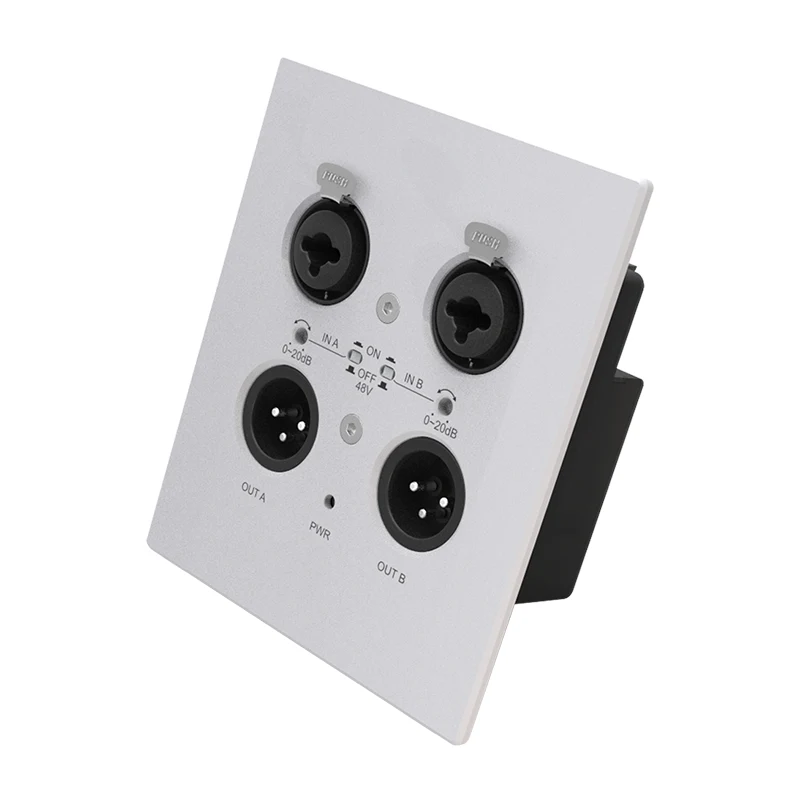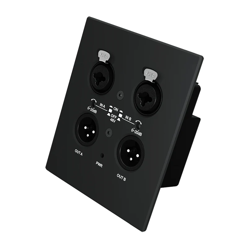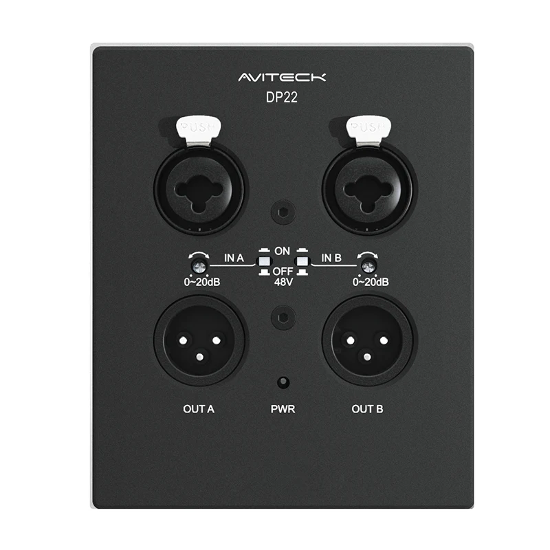 FHBAVTEC® Dante 2 Ch Wall Tấm giao diện âm thanh (DP22) có mô-đun Dante tích hợp để chuyển tín hiệu kỹ thuật số tương tự sang Dante và công tắc điện ảo đầu vào kênh kép. Một tính năng tuyệt vời khác là nó có thể được cung cấp năng lượng Poe.